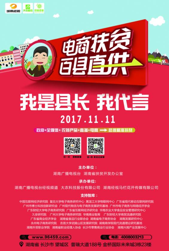 2017年,中央一号文件首次将农村电商单独列出,要求着力推进农村电商发展。作为精准扶贫的有效新模式,电商扶贫对于贫困县域产业发展具有重大意义。电商扶贫将电子商务纳入扶贫开发工作体系,以“互联网+农业”的力量创新扶贫方式,促进贫困县农民增收,推进农业区域农产品品牌建设。11月11日,由湖南广播电视台、湖南省扶贫开发办公室联合主办的“电商扶贫 百县直供——2017我是县长我代言”24小时网络直播大型公益活动将在湖南长沙举办。